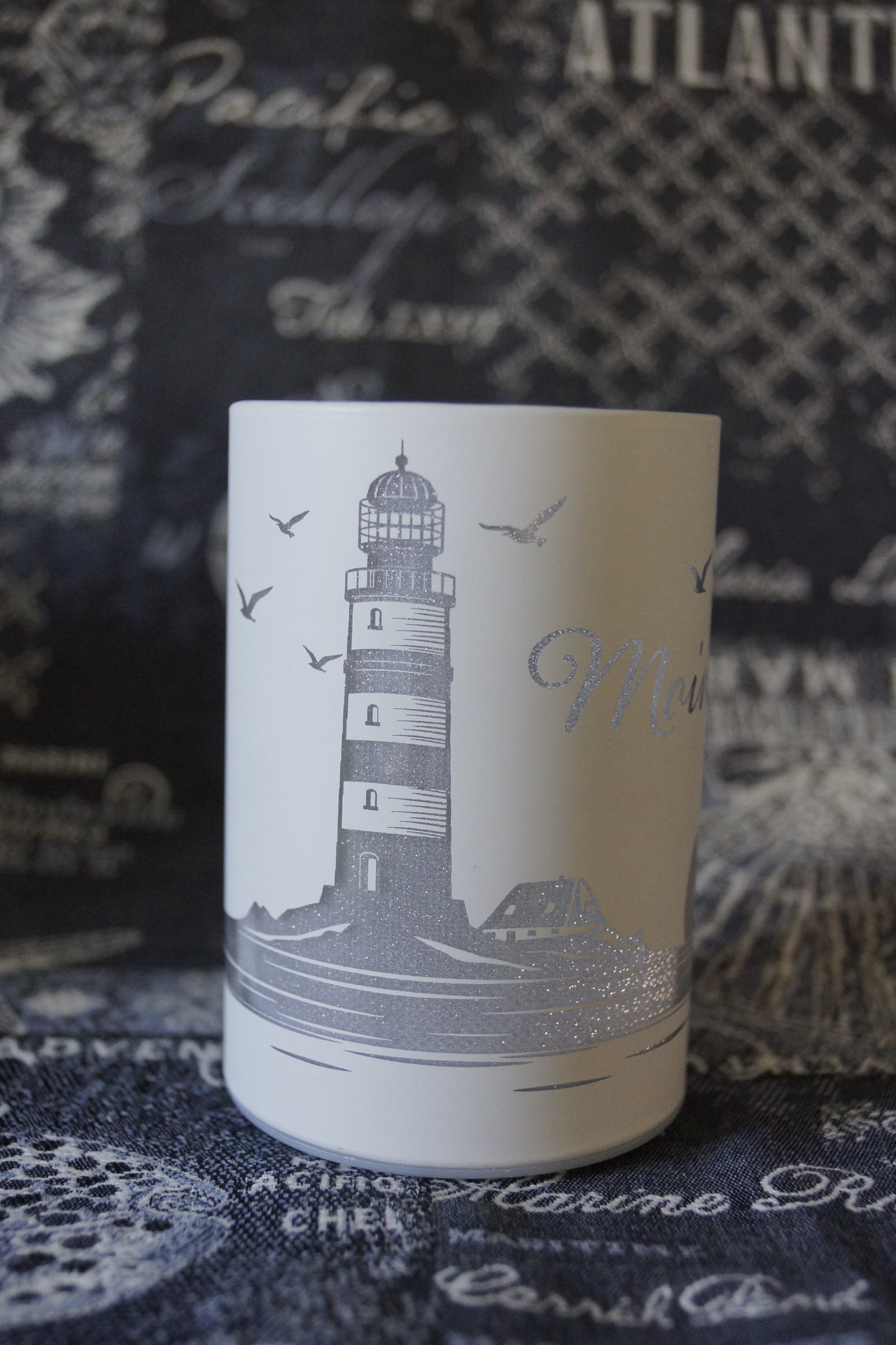 Wunderschönes Segelschiff auf der einen und Leuchtturm auf der anderen Seite und dabei der Schriftzug "Moin". Möwen und ein kleines Segelboot gen Sonnenuntergang sind auch dabei. Alles durch die innenliegende LED Lichterkette hinterleuchtet. Dank Timer erfreut sich Tag für Tag aufs Neue der Besitzer. Das bringt doch Nord- und Ostsee in jedes Badezimmer oder in die maritime Dekoration.